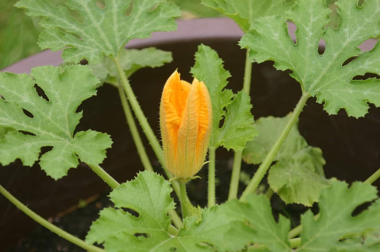 Parts: The Flower. If you want to have your squash harvest AND eat the flowers too, pick only the “male flowers”. The male flowers have a long thin stem (see photo) and will grow around the outside edges of the plant. The female flowers are usually close to the center of the plant and have a small, bulbous base at the bottom of the flower where it meets the stem. The bulbous base is what will turn into the squash or zucchini.