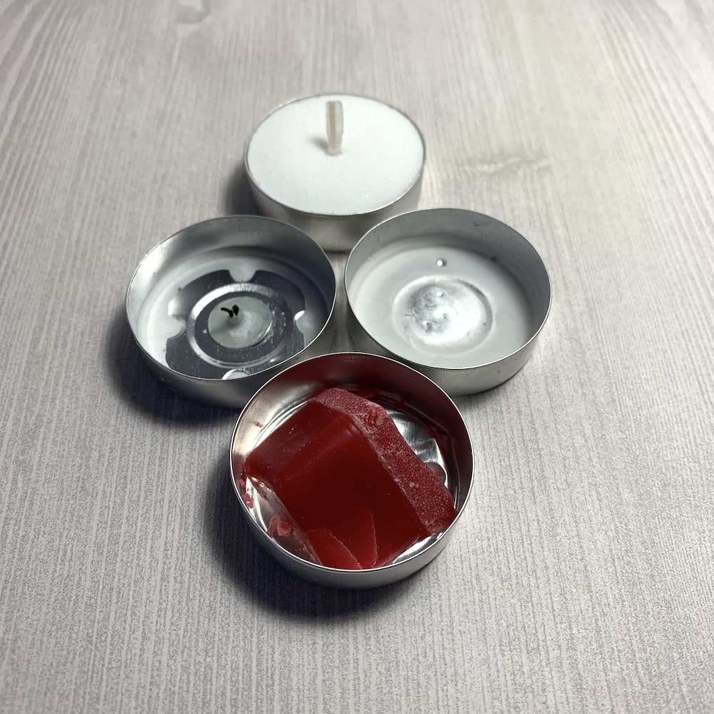 1. Cut a melt in half and put it into an empty tea-light tin. I have found that a 1/2 cube of melt will fit nicely in a 1/4″ high tin.